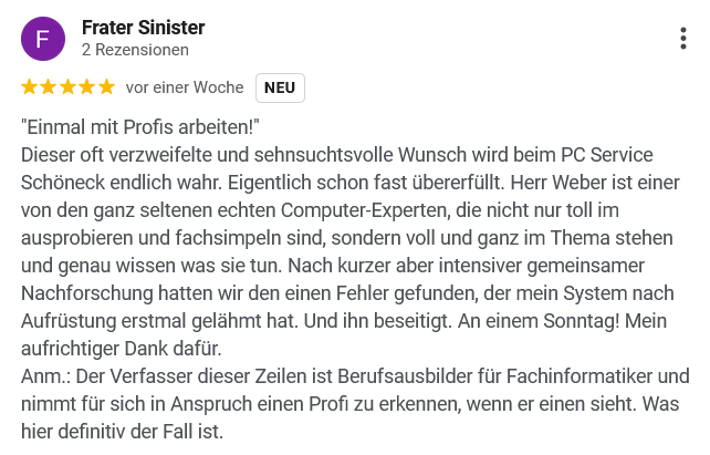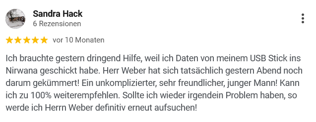 Computer-Probleme kann ich deshalb sehr schnell identifizieren und lösen. Besonders wichtig ist mir dabei, individuell auf Ihre Lage einzugehen, alle Schritte verständlich zu erklären und verlässlich für Sie erreichbar zu sein.